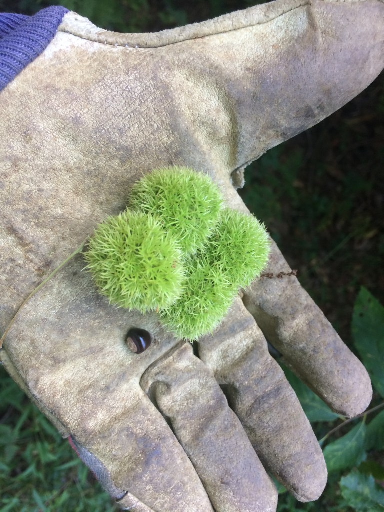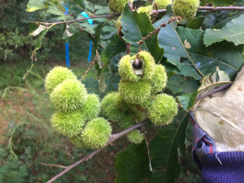 A small group from the Friends of Michaux spent a beautiful Sunday morning on August 8 harvesting seeds from a grove of allegheny chinquapins (Castanea pumila). These small trees are related to the American chestnut (Castanea dentata), a tree that is now virtually extinct from North America due to the chestnut blight. Like its larger relative, the chinquapin has great value for wildlife and foresters seek to increase its numbers in Michaux State Forest. The seeds we collected on Sunday will go to nurseries for germination.