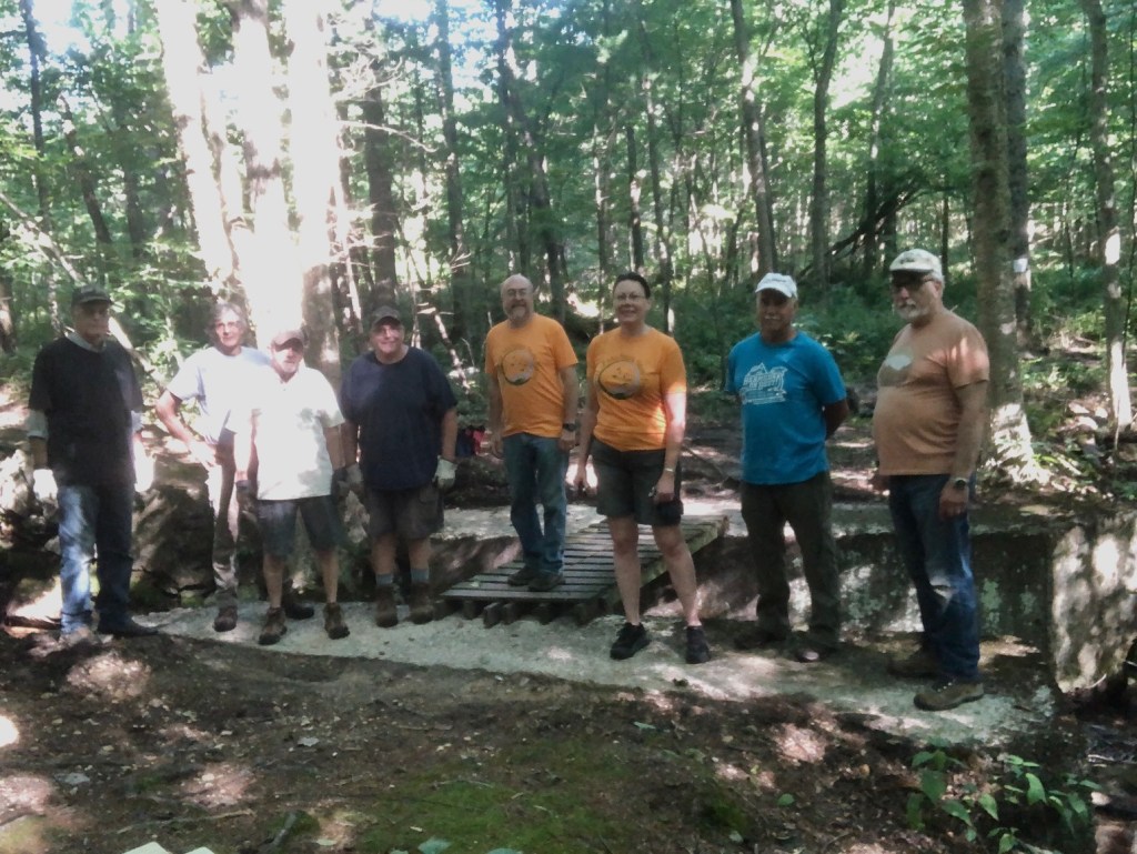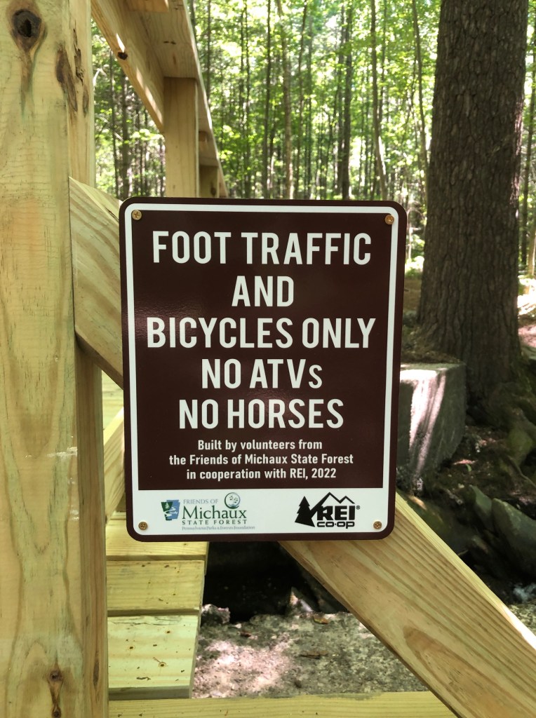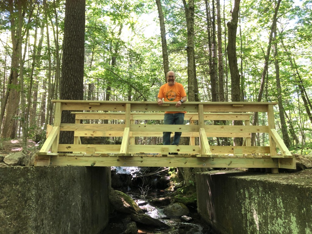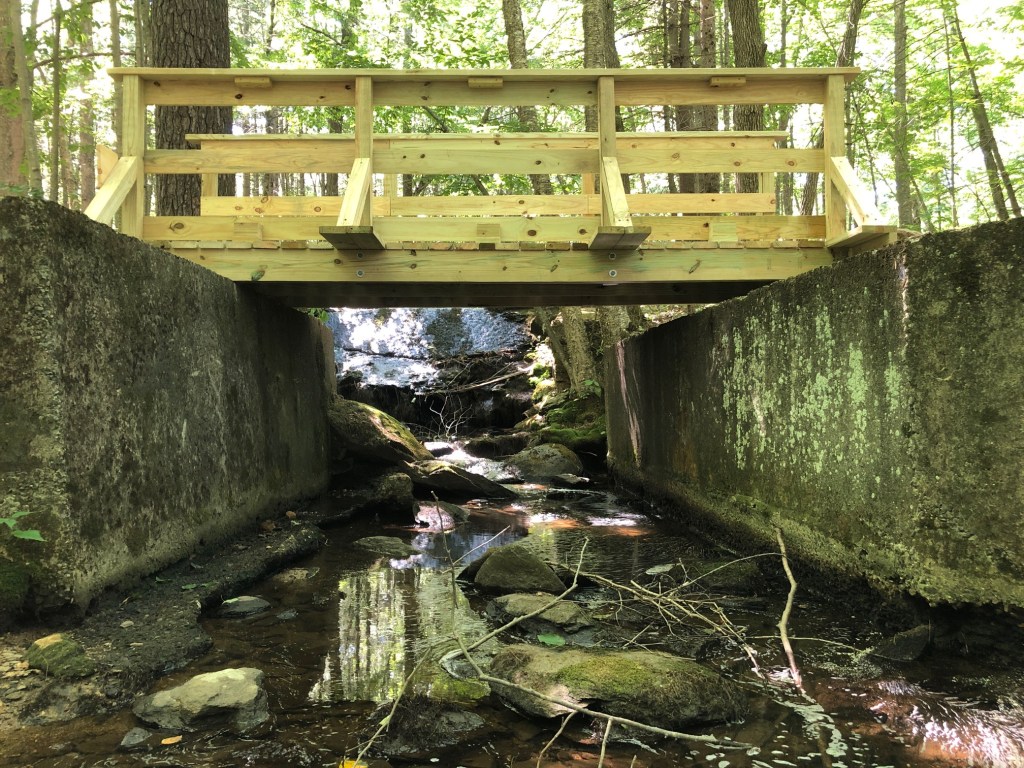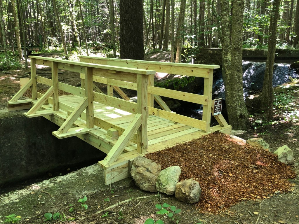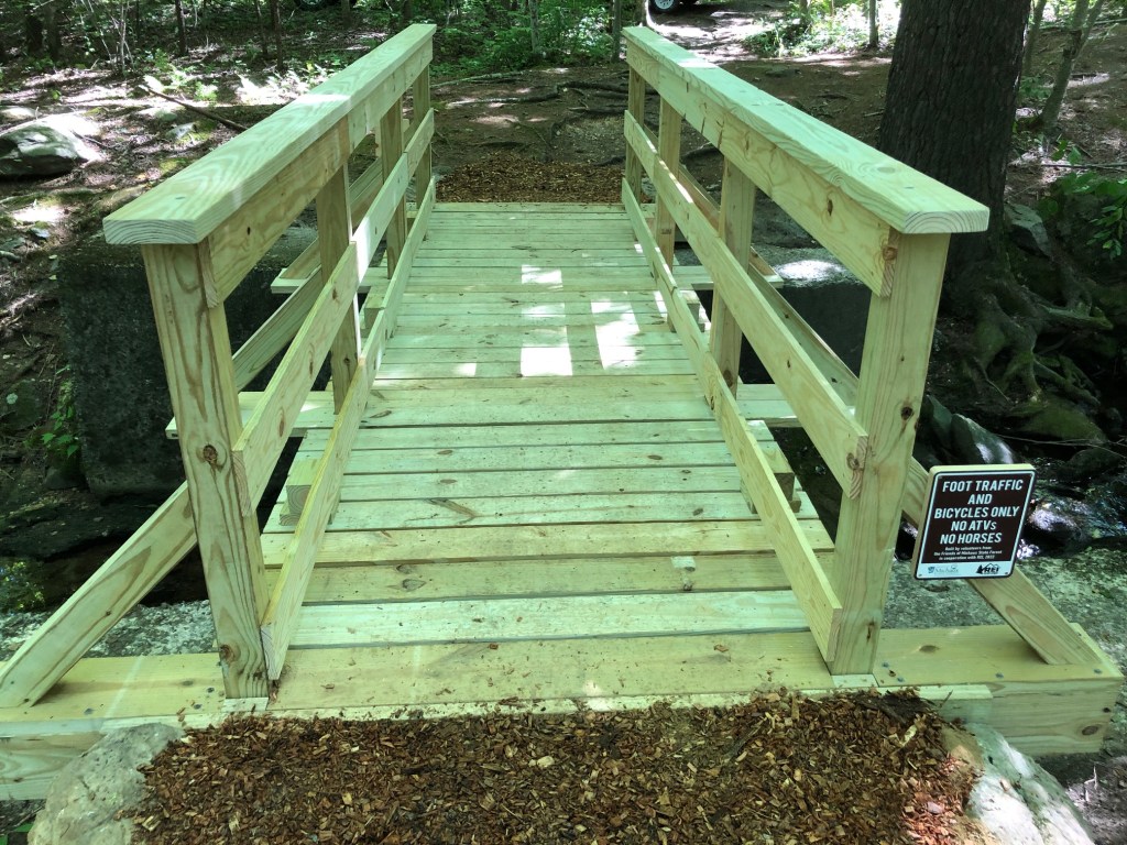 You may be familiar with this bridge at the “upper dam” in Camp Michaux – no hand railings, a little wobbly. Now, thanks to a great group of volunteers (led by Andre Weltman) and funding from REI, that bridge has been replaced. It’s super nice, check it out!